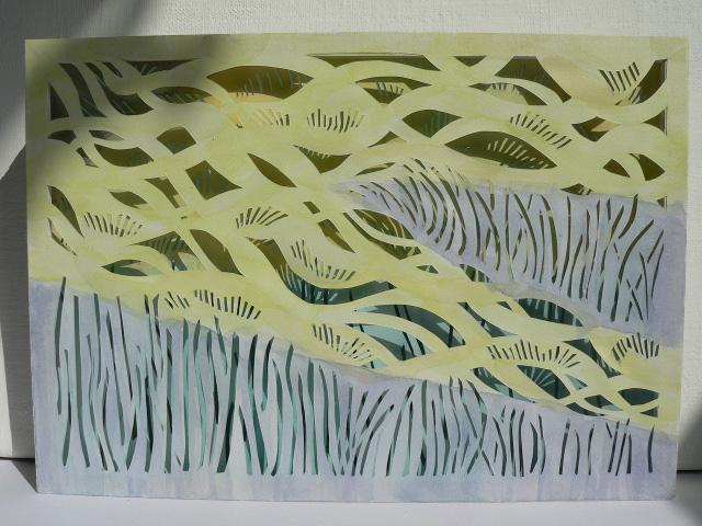 Die Arbeiten bestehen aus Papieren, die mit Aquarellfarbe von mir gefärbt wurden. Die Formen entstanden durch Einschnitte mit einem Cutter. Die zwei oberen Papierebenen wurden durch kleine Holzrahmen mit Abstandhaltern an den Ecken stabilisiert und übereinander gestaffelt. Der Abstand von einem Zentimeter zwischen den Ebenen ermöglicht den Lichteinfall von jeder Seite. Die unterste Papierschicht ist komplett auf eine dünne Sperrholzplatte aufgezogen, die alle drei Lagen stabil zum Aufhängen zusammenhält.