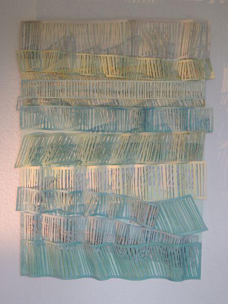 Die Arbeiten bestehen aus Papieren, die mit Aquarellfarbe von mir gefärbt wurden. Die Formen entstanden durch Einschnitte mit einem Cutter. Die Papierebenen wurden durch Wölben und Fixieren auf der Grundplatte übereinander gestaffelt und ermöglicht ein Licht- und Schattenspiel zwischen den einzelnen Ebenen. Die unterste Papierschicht ist komplett auf eine dünne Sperrholzplatte aufgezogen, die alle Lagen stabil zum Aufhängen zusammenhält.