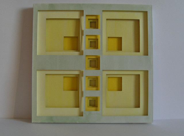 Die Arbeiten bestehen aus Papieren, die mit Aquarellfarbe von mir gefärbt wurden. Die Formen entstanden durch Einschnitte mit einem Cutter. Die zwei oberen Papierebenen wurden durch kleine Holzrahmen mit Abstandhaltern an den Ecken stabilisiert und übereinander gestaffelt. Der Abstand von einem Zentimeter zwischen den Ebenen ermöglicht den Lichteinfall von jeder Seite. Die unterste Papierschicht ist komplett auf eine dünne Sperrholzplatte aufgezogen, die alle drei Lagen stabil zum Aufhängen zusammenhält.