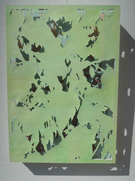 Die Arbeiten bestehen aus Papieren, die mit Aquarellfarbe von mir gefärbt wurden. Die Formen entstanden durch Einschnitte mit einem Cutter. Die zwei oberen Papierebenen wurden durch kleine Holzrahmen mit Abstandhaltern an den Ecken stabilisiert und übereinander gestaffelt. Der Abstand von einem Zentimeter zwischen den Ebenen ermöglicht den Lichteinfall von jeder Seite. Die unterste Papierschicht ist komplett auf eine dünne Sperrholzplatte aufgezogen, die alle drei Lagen stabil zum Aufhängen zusammenhält.