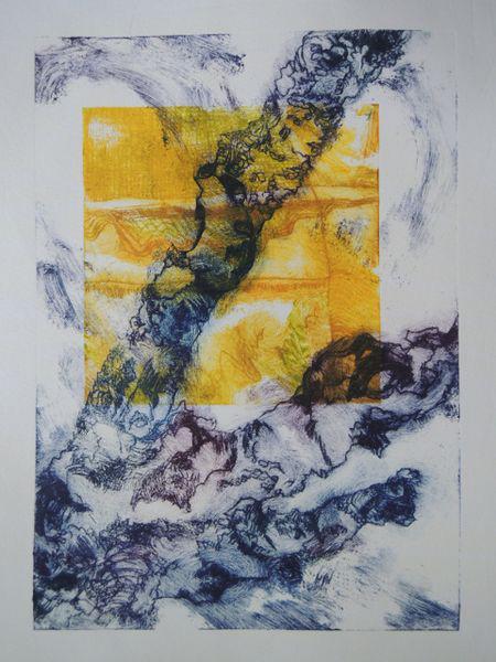 Die Farbradierung ist mit zwei verschieden großen Druckplatten, die übereinander gedruckt wurden,hergestellt. Dabei ist jede Platte mit mehreren Farbnuancen gestaltet, die unmittelbar aufgetragen und unterschiedlich stark ausgewischt wurden.