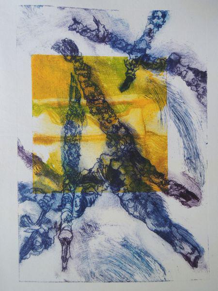 Die Farbradierung ist mit zwei verschieden großen Druckplatten, die übereinander gedruckt wurden,hergestellt. Dabei ist jede Platte mit mehreren Farbnuancen gestaltet, die unmittelbar aufgetragen und unterschiedlich stark ausgewischt wurden.