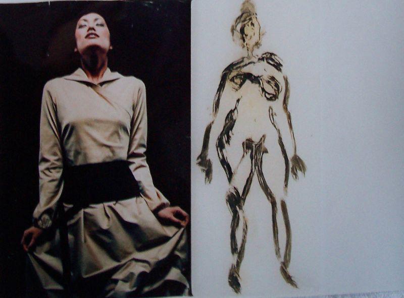 die pinselzeichnungen entstanden zuerst- dann stieß ich auf die ausdrucksgleichen werbeseiten. der satz eines bleistiftdünnen models: „tief in mir sitzt eine kleine,fette, gefräßige frau“ hat mich zu diesen 12 zusammenstellungen gebracht.