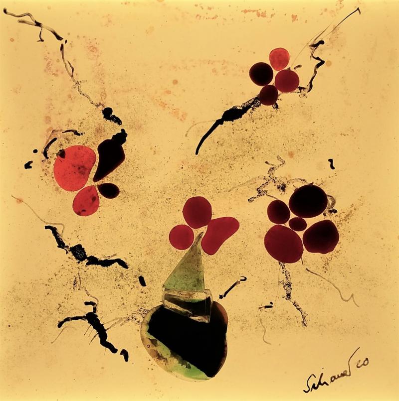 Das Kunstwerk besteht aus einem mit LED beleuchteten Rahmen,Glasmalerei und gefustem Glas