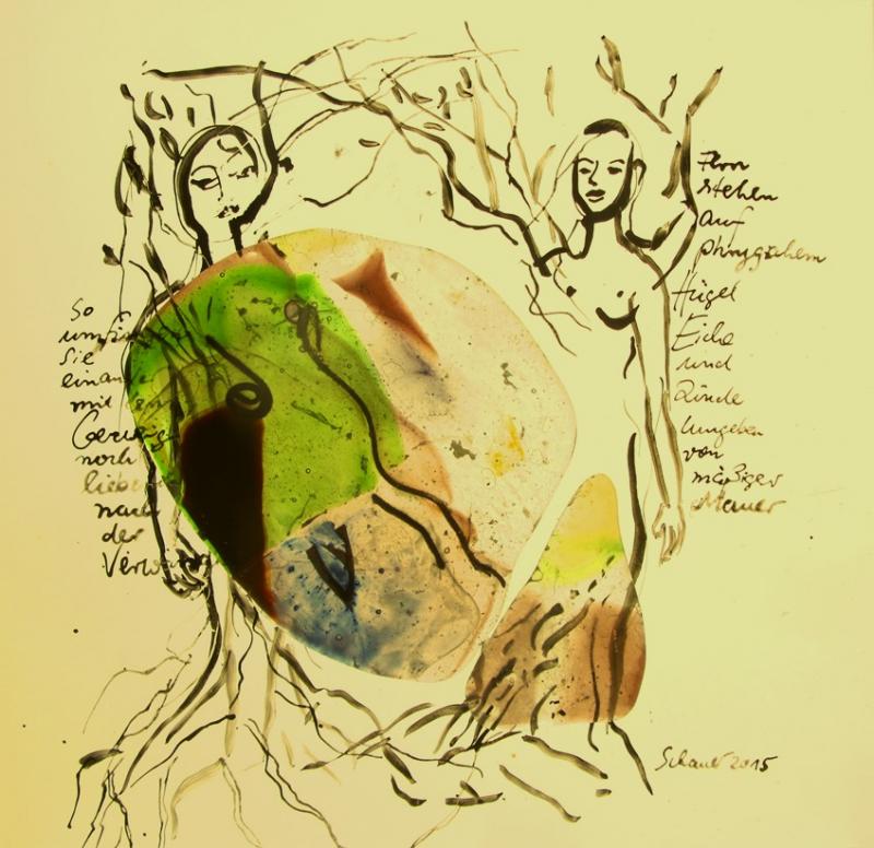 Zugrunde liegt ein Text des antiken Dichters Ovid aus dessen Schriften "Metamorphosen". Worum geht es? Um Gastfreundschaft, Großzügigket und eine große Liebe. Philemon und Baucis werden wegen ihrer Gastfreundschaft (sie gewähren den Durchreisenden Jupiter und Hermes eine Unterkunft für die Nacht) von den Göttern mit einem langen Leben belohnt. Am Ende ihres Lebens werden sie in Bäume verwandelt. Diesen Moment der Verwandlung habe ich in meinem Kunstwerk aufgegriffen. Bei Ovid sind es Eiche und Linde, in die die beiden Liebenden verwandelt werden, bei dem libanesischen Dichter und Philosoph Khalil Gibran sind es Eiche und Zypresse, mit denen die Menschen verglichen werden. Diese können nicht im gegenseitigen Schatten wachsen und brauchen daher einen gewissen Abstand.