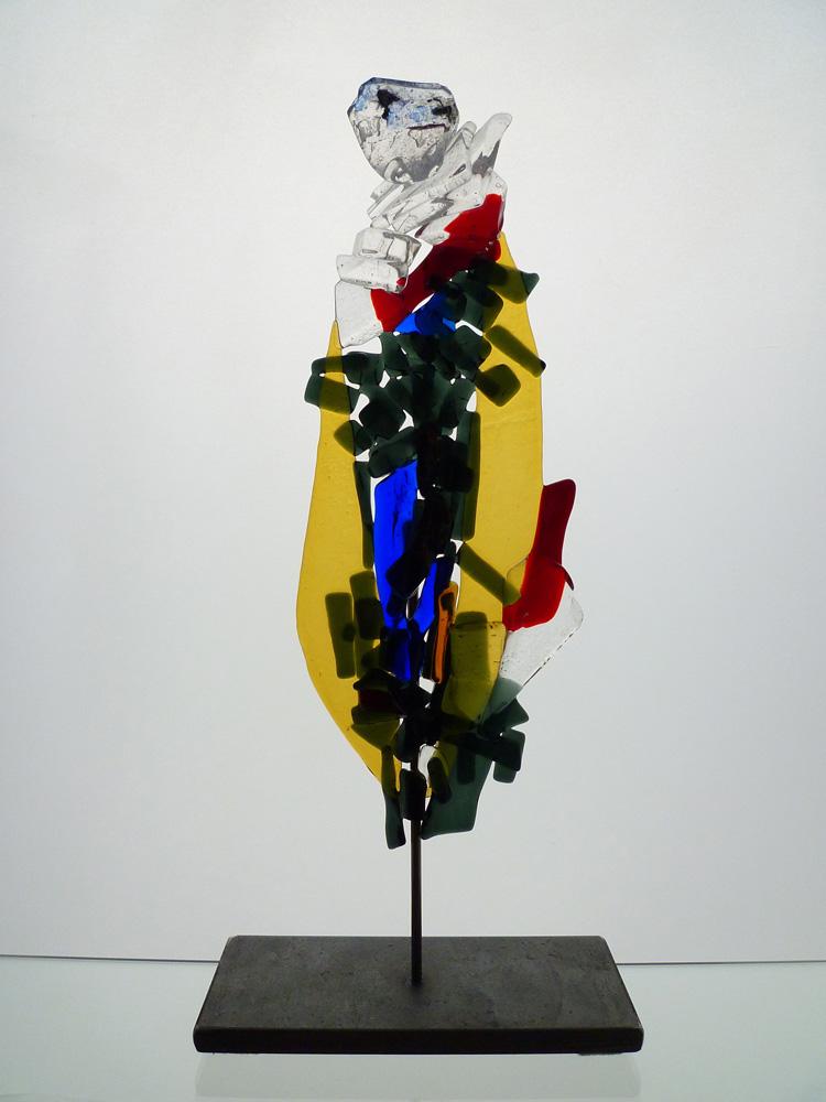 Die Skulptur besteht aus gefustem Glas mit Metallstab und Stahsockel