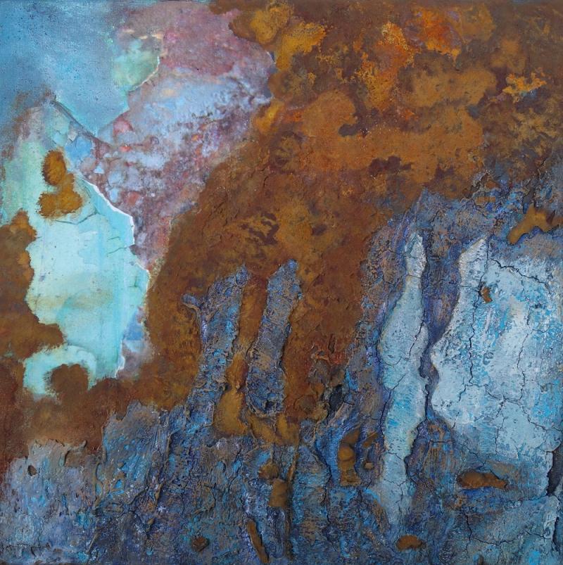 Mixed Media u.a. mit Transfer eigener Fotos, Marmormehl, Rosteffekten